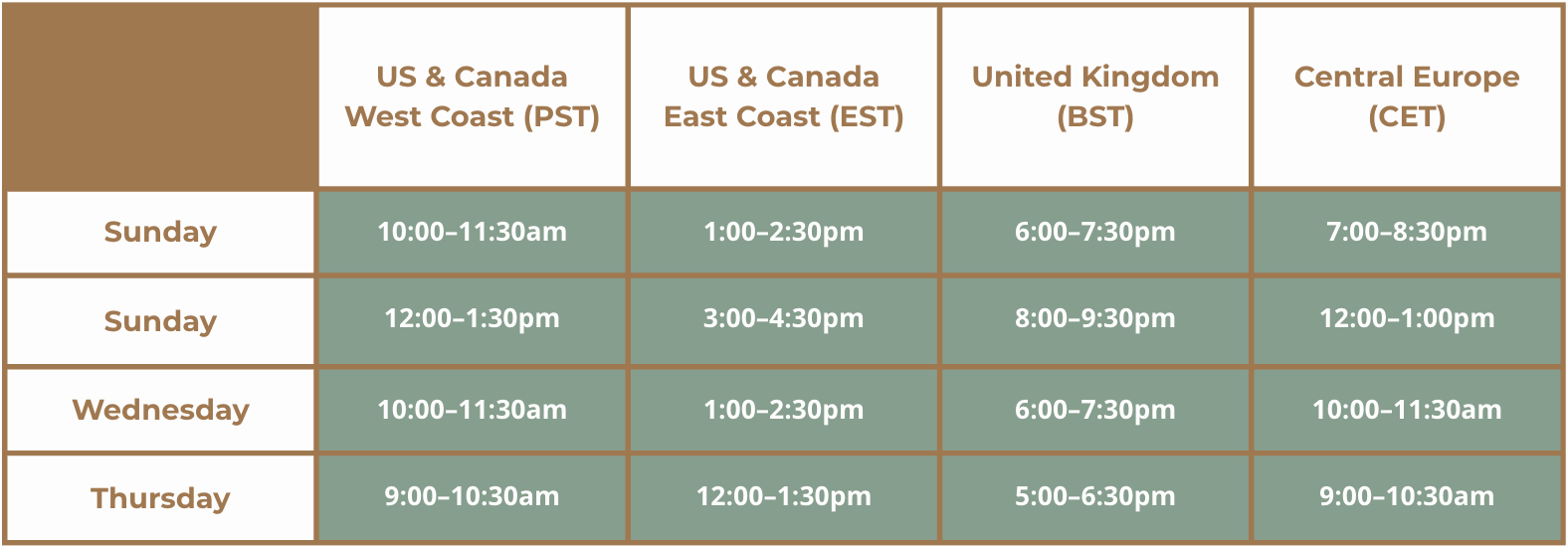 First week of May to the third week of June. Our weekly live sessions will be on Sundays 10am-12pm PST, 6pm-8pm BST.